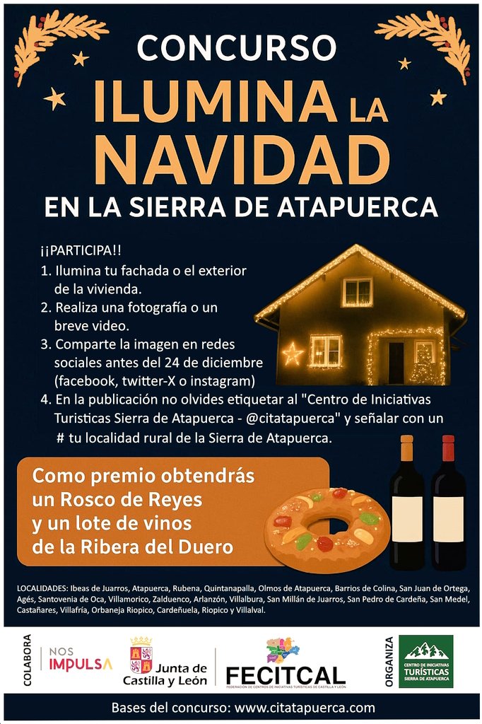 La Sierra de Atapuerca lanza un año más el concurso “Ilumina la Navidad”, una iniciativa que invita a los vecinos de la zona a decorar e iluminar las fachadas y exteriores de sus viviendas con motivos navideños, con el objetivo de llenar de luz y ambiente festivo las localidades de la comarca.